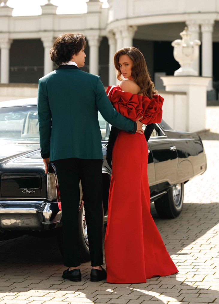 Ši Nataly Styran "Melania" suknelė – tikras mados šedevras, skirtas moteriai, kuri nori prikaustyti dėmesį ir spinduliuoti neprilygstamą eleganciją. Dramatiška, 3D gėlių formos puošmenomis dekoruota viršutinė dalis sukuria prabangų ir teatrališką efektą, pabrėždama unikalų suknelės dizainą. Sodri, aistringa raudona spalva simbolizuoja stiprybę ir pasitikėjimą savimi, o prigludusi silueto forma išryškina figūrą. Aukštas skeltukas suteikia judesiui grakštumo ir subtilaus jausmingumo, o ilgos juodos pirštinės – papildomas aristokratiškumo akcentas. Ši suknelė – ne tik apranga, bet ir pareiškimas, skleidžiantis drąsą ir moteriškumą.