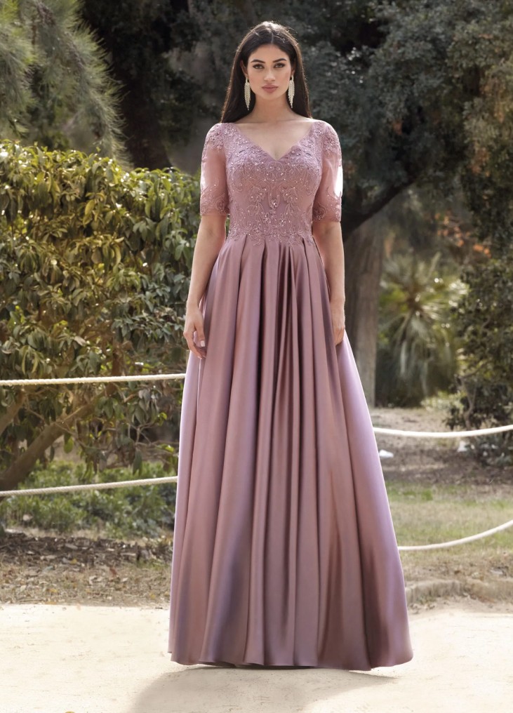 Ši nuostabi vakarinė suknelė dvelkia romantika ir elegancija. Švelnios rožinio aukso spalvos atspalvis suteikia prabangos pojūtį, o suknelės dizainas harmoningai dera tarp klasikos ir modernumo. Viršutinė dalis puošta išskirtiniais nėriniais ir subtiliais karoliukais, kurie sukuria švelnų žėrėjimą bei prideda rafinuotumo. Pusiau permatomos trijų ketvirčių rankovės suteikia grakštumo ir subtilumo, o lengvai krintantis ilgas sijonas su klostėmis sukuria ore plevenančio lengvumo įspūdį. Ši suknelė idealiai tinka iškilmingoms progoms, suteikdama elegantišką ir nepakartojamą įvaizdį.