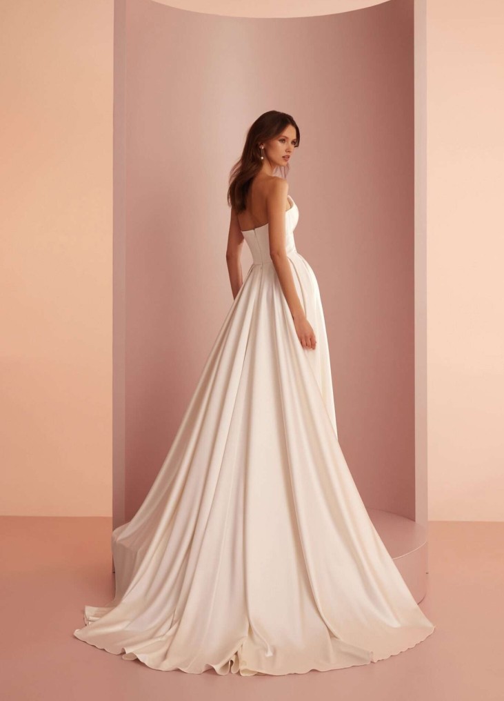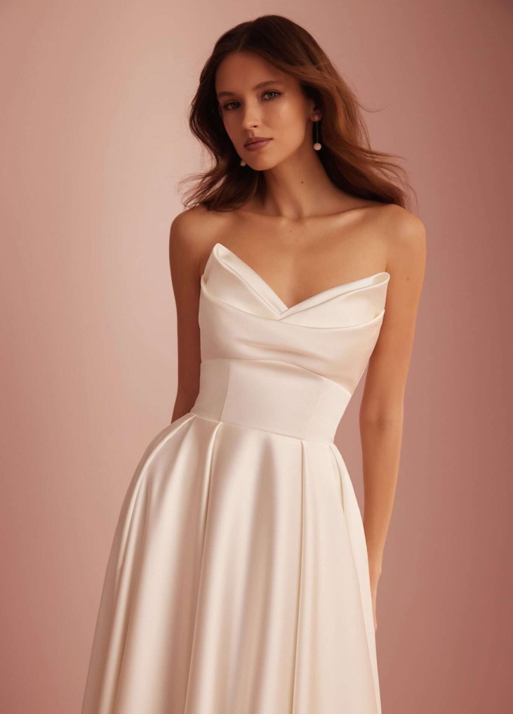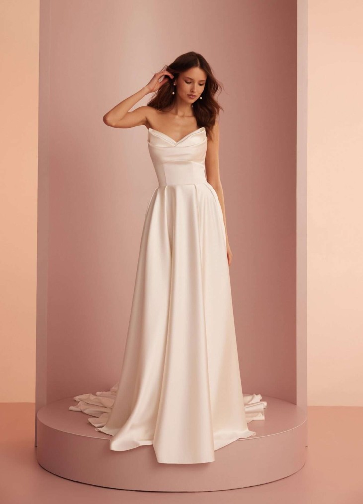 Ši Ariamo firmos suknelė spinduliuoja subtilia elegancija ir minimalistiniu grožiu. Klasikinis A siluetas pabrėžia figūrą, o prigludusi korsetinė viršutinė dalis su švelniai krentančiu sijonu suteikia romantišką ir lengvą įvaizdį. Suknelės išskirtinumas slypi jos dailiai suformuotame, elegantiškai drapiruotame širdelės formos iškirptės dizaine, kuris subtiliai paryškina pečius ir kaklą. Šis modelis puikiai tiks nuotakai, vertinančiai nesenstančią klasiką su moderniu akcentu.