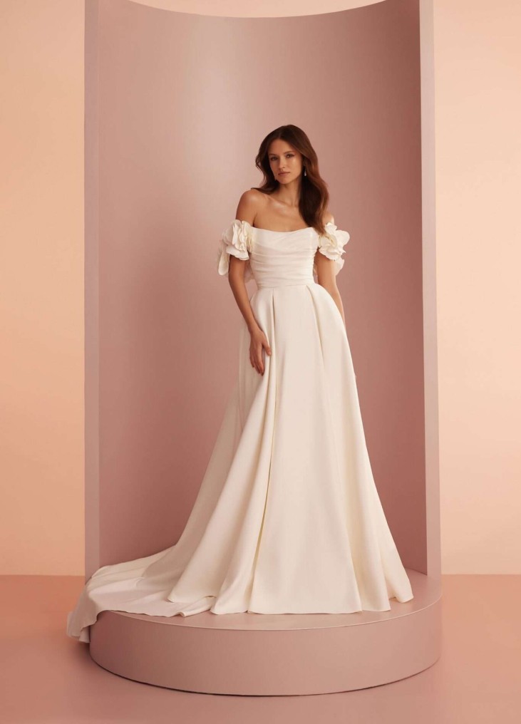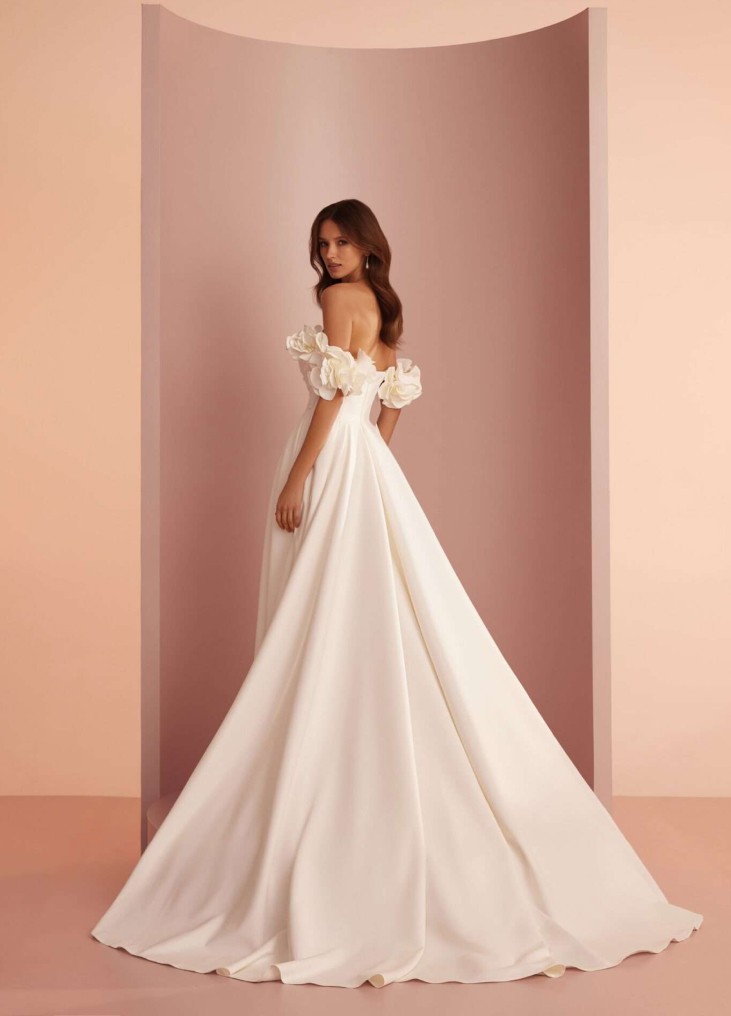 Ši Ariamo suknelė įkūnija romantišką ir svajingą estetiką, puikiai tinkamą tiek klasikinei, tiek bohemiškai nuotakai. Nuleistos, pūstos rankovės su subtiliomis gėlėmis suteikia švelnų, moterišką akcentą, o prigludęs korsetas su lengvu klostavimu išryškina taliją, sukuriant elegantišką siluetą. Platus, ilgas sijonas su lengvu šleifu suteikia didingumo, tačiau išlieka lengvas ir grakštus. Ši suknelė alsuoja nesenstančia elegancija, o jos natūralus, neperkrautas dizainas leidžia spindėti natūraliam nuotakos grožiui. Tai puikus pasirinkimas toms, kurios siekia švelnios prabangos su romantiškais elementais.