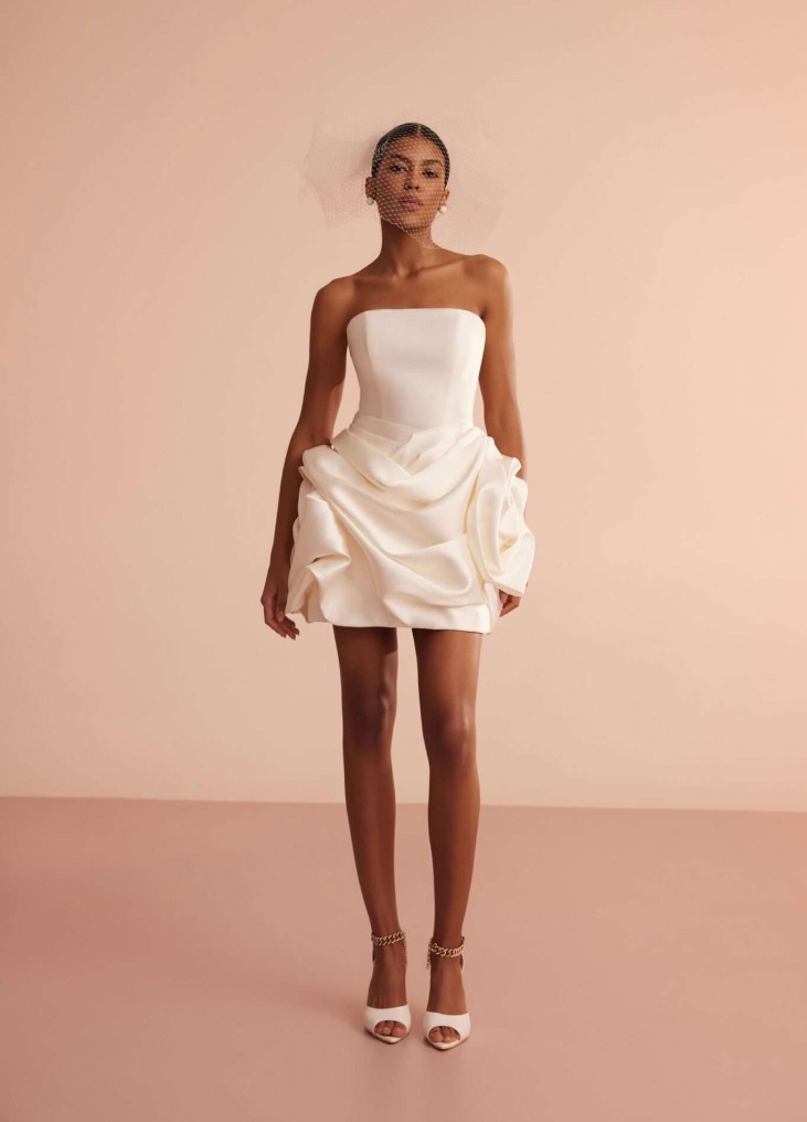 Ši Ariamo firmos suknelė yra elegantiškas ir modernus pasirinkimas ypatingoms progoms. Trumpas, prigludęs korsetas su tiesia iškirpte suteikia minimalistinį ir rafinuotą įvaizdį, o sijonas su dramatiškomis, skulptūriškomis klostėmis sukuria unikalią, skulptūrišką formą, primenančią gėlių žiedlapius. Subtili, kreminė baltos spalva pabrėžia prabangą, o aksesuarai – aukštakulniai su auksinėmis detalėmis ir minimalistinis šydas – suteikia prabangų, bet kartu modernų nuotakos ar vakarinį įvaizdį. Tai puikus pasirinkimas toms, kurios vertina šiuolaikinį dizainą, bet nori išlaikyti subtilią klasikinę eleganciją.