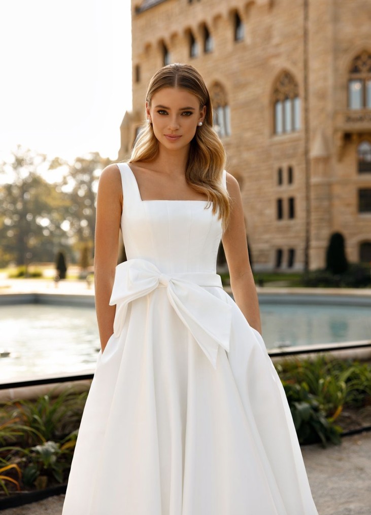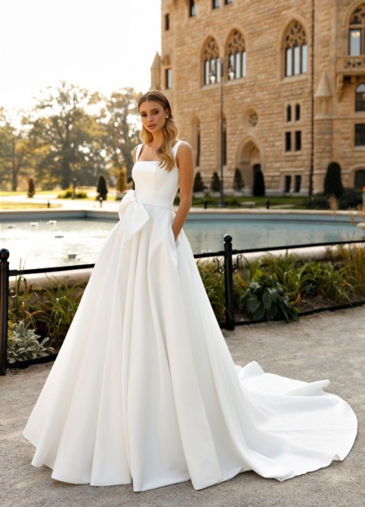 Ši Nataly Styran "Javelly" suknelė įkūnija minimalistinę eleganciją ir karališką prabangą. Klasikinis kvadratinės formos korsetas su plonomis petnešėlėmis suteikia modernų, rafinuotą įvaizdį, išryškindamas moters laikyseną ir siluetą. Platus, klostuotas sijonas su ilgu šleifu suteikia didingumo, o prabangus audinys užtikrina grakštų kritimą ir nepriekaištingą formą. Subtilus kaspino akcentas ties juosmeniu suteikia romantiško žavesio, pabrėždamas nuotakos eleganciją. Diskretiškos kišenės prideda šiuolaikiško funkcionalumo, leidžiančio jaustis patogiai ir užtikrintai. Tai tobula suknelė nuotakai, vertinančiai nesenstančią klasiką, minimalizmą ir rafinuotą prabangą.