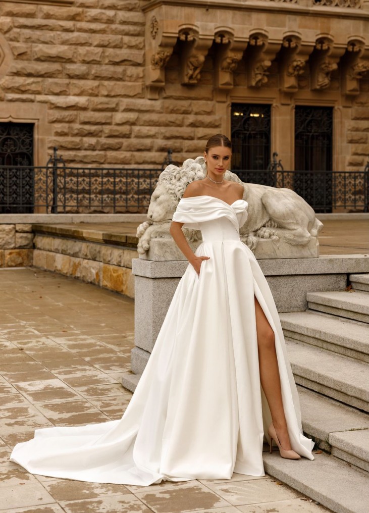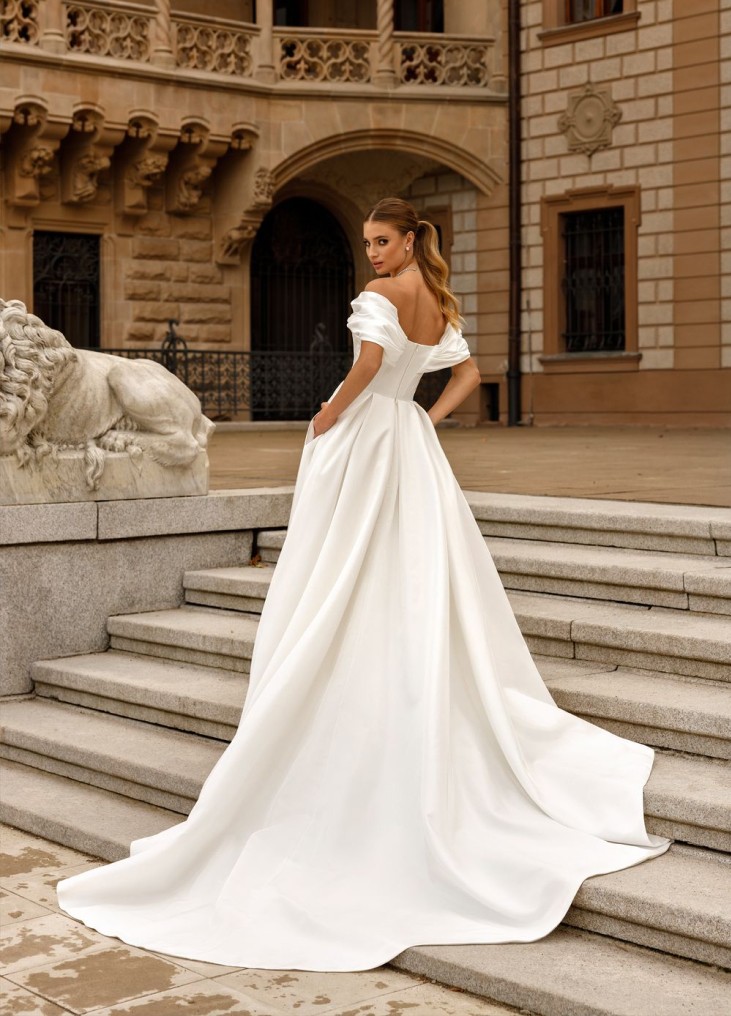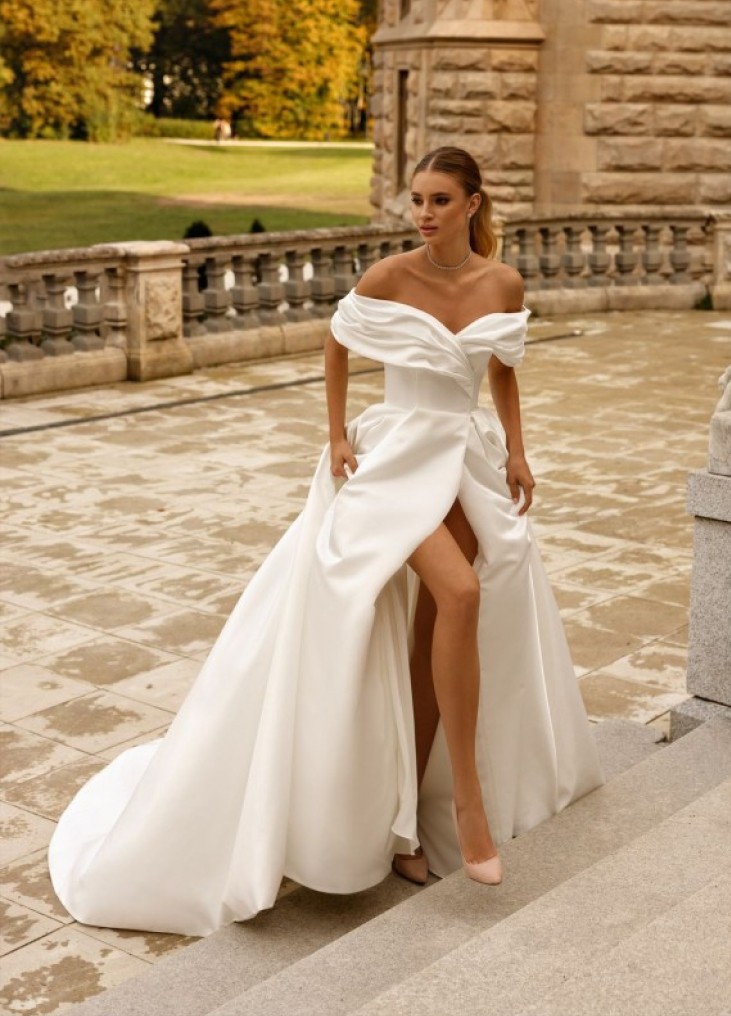 Ši Nataly Styran "Jolie" suknelė – tai tobulas klasikinės elegancijos ir modernios prabangos derinys. Pečius atidengianti, dramatiškai drapiruota viršutinė dalis sukuria karališką, bet kartu jausmingą siluetą, subtiliai pabrėždama dekoltė liniją. Pabrėžtas korsetas grakščiai formuoja figūrą, o aukštas skeltukas suteikia dinamiškumo ir jausmingumo, leidžiant nuotakai elegantiškai judėti. Prabangus, sunkiai krintantis audinys suteikia struktūros ir išskirtinumo, o ilgas šleifas prideda didingumo pojūtį. Tai suknelė, skirta drąsiai, moderniai nuotakai, kuri nori spindėti ir jaustis išskirtinai savo ypatingą dieną.