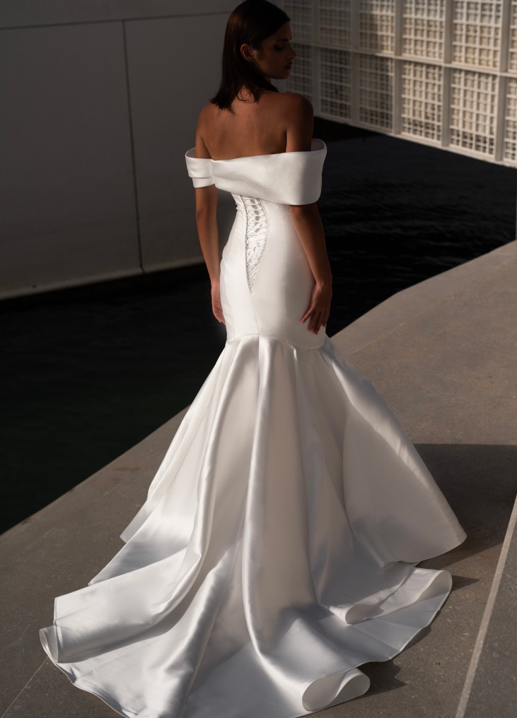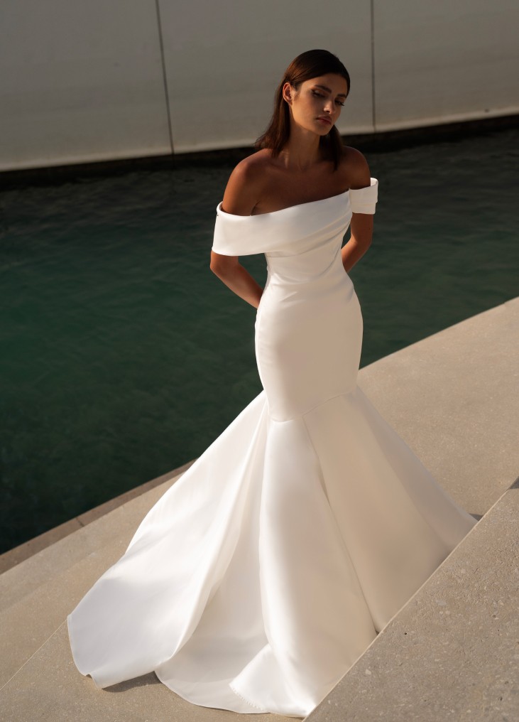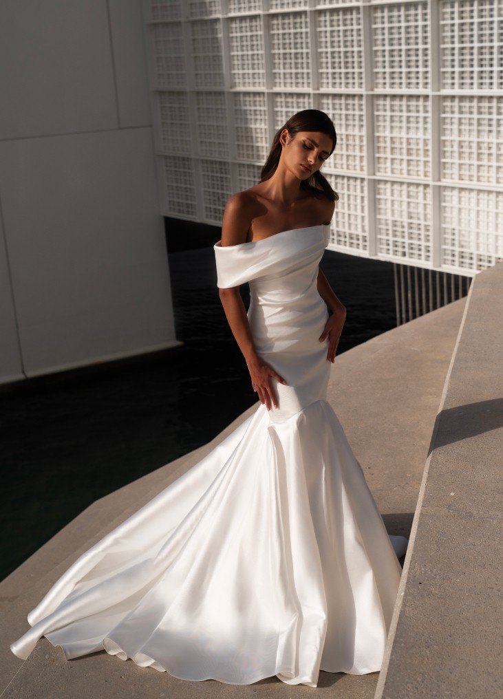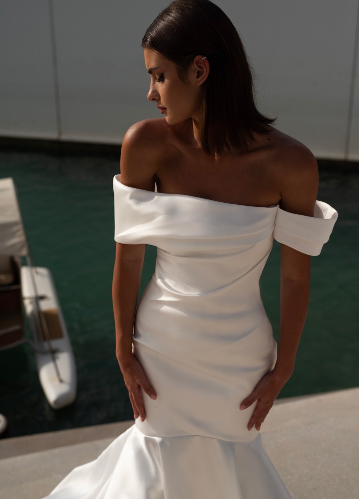 Elegantiška Romanova vestuvinė suknelė – moderni klasika su off-shoulder dizainu ir grakščiai krentančiu A silueto sijonu, suteikiančiu lengvumo ir prabangos pojūtį. Minimalistinis stilius išryškina natūralų grožį, o aukštos kokybės audiniai užtikrina komfortą. Pasirinkite Romanova Bridal, kad jūsų ypatinga diena būtų nepriekaištinga.