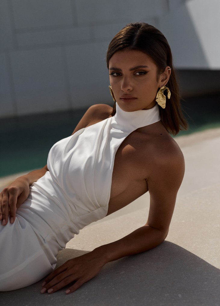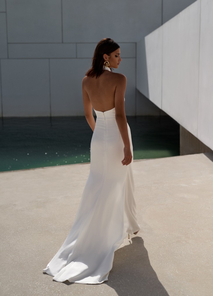 Ši moderni balta vakarinė suknelė su aukštu skeltuku ir halter tipo iškirpte išsiskiria elegancija bei prabangiu minimalizmu. Kūno linijas išryškinantis siluetas bei prabangiai krintantis audinys suteikia išskirtinio žavesio, o asimetriški drapiruoti akcentai subtiliai pabrėžia moteriškumą. Aukštas skeltukas prideda drąsos ir suteikia lengvumo judesiams, todėl ši suknelė puikiai tinka vestuvėms, iškilmingiems renginiams ar fotosesijoms. Ieškote stilingos ir modernios vestuvinės ar vakarinės suknelės? Šis dizainas sujungia klasikinį rafinuotumą su šiuolaikine mada.