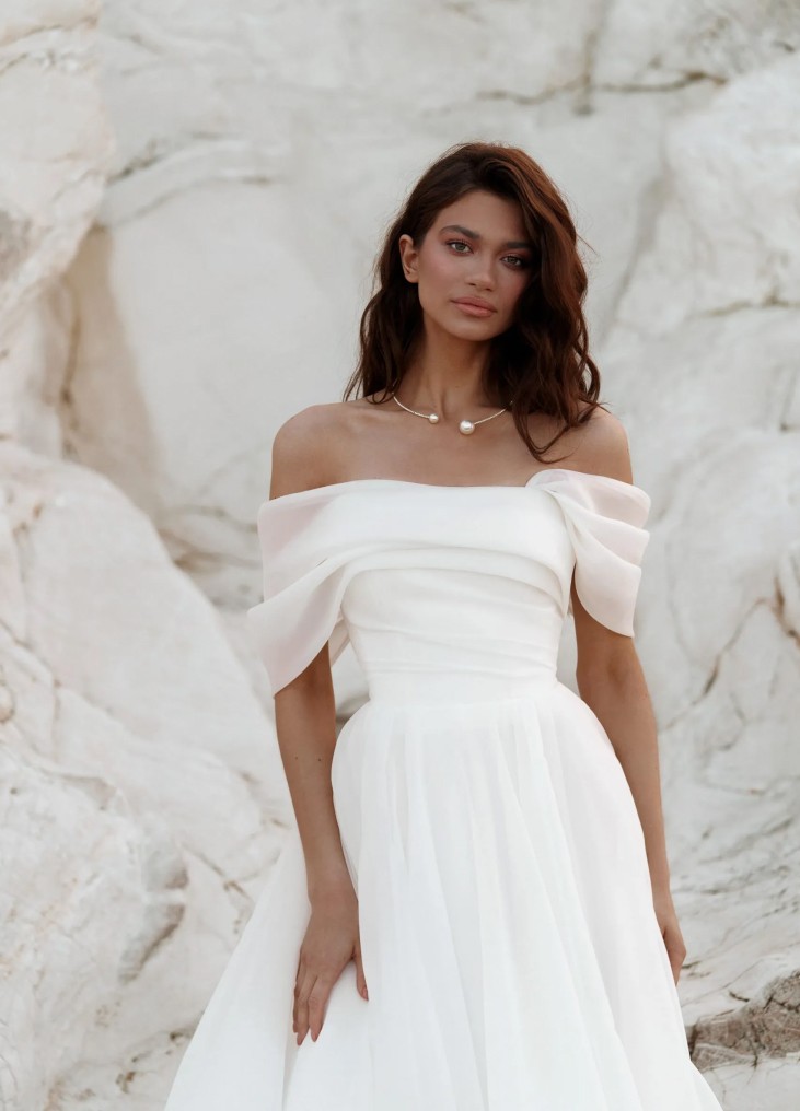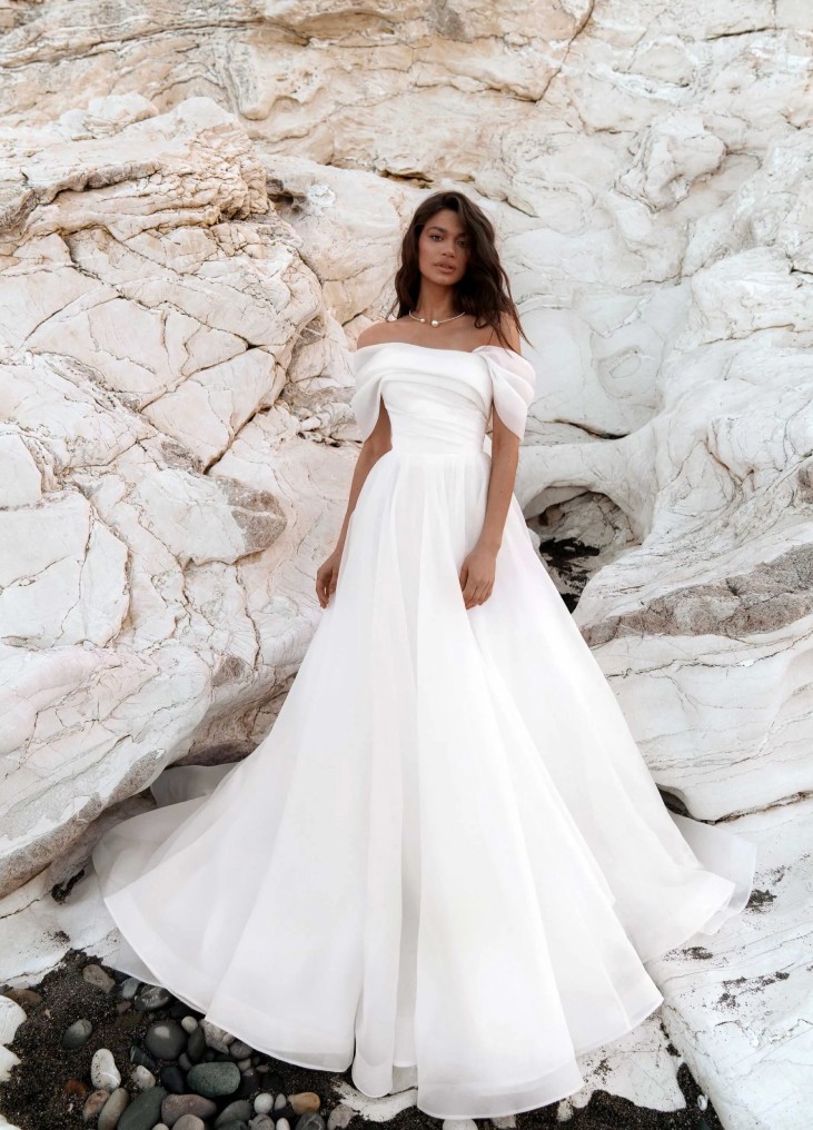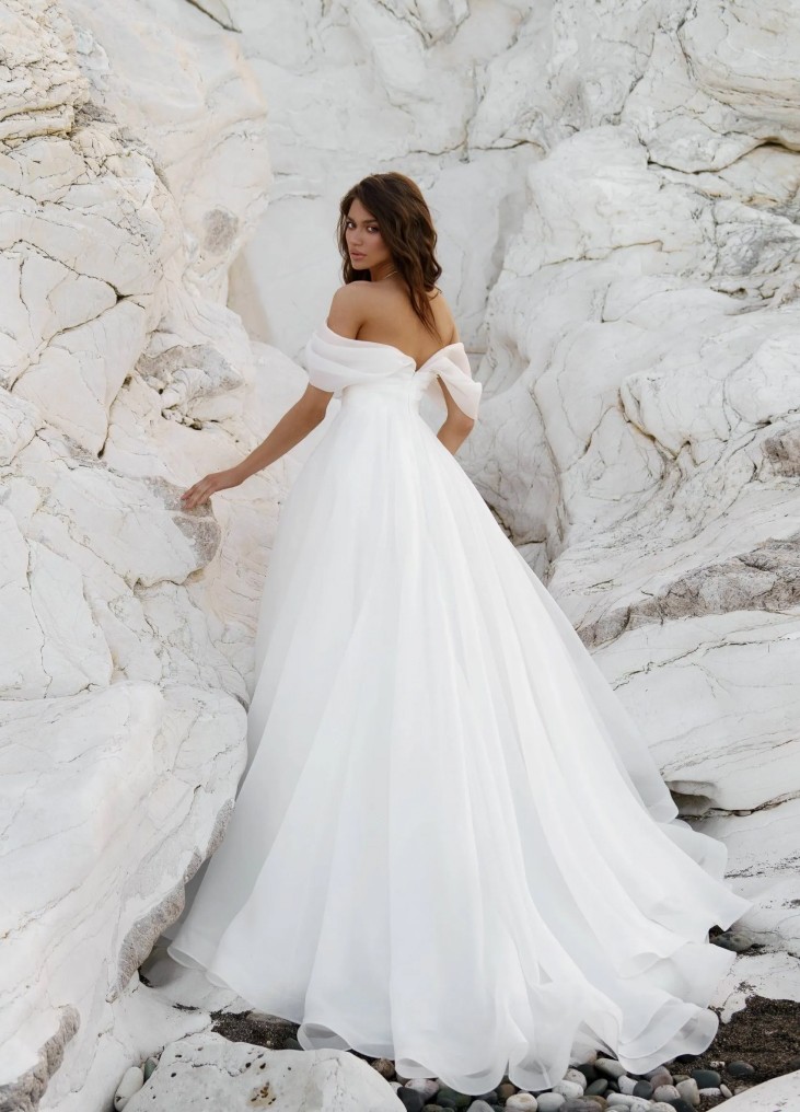 Ši vestuvinė suknelė išsiskiria subtilia romantika ir nesenstančia elegancija. A linijos siluetas gražiai pabrėžia liemenį ir lengvai pereina į platų, lengvai krentantį sijoną, kuris sukuria lengvumo ir grakštumo pojūtį. Atviri pečiai ir švelniai drapiruota viršutinė dalis suteikia įvaizdžiui moteriškumo bei rafinuoto žavesio, o korsetinė konstrukcija išryškina figūrą. Lengvas, švelniai banguojantis audinys judant atrodo itin elegantiškai ir suteikia suknelės siluetui lengvumo. Tai puikus pasirinkimas nuotakai, kuri svajoja apie romantišką, modernų ir itin elegantišką vestuvių įvaizdį.