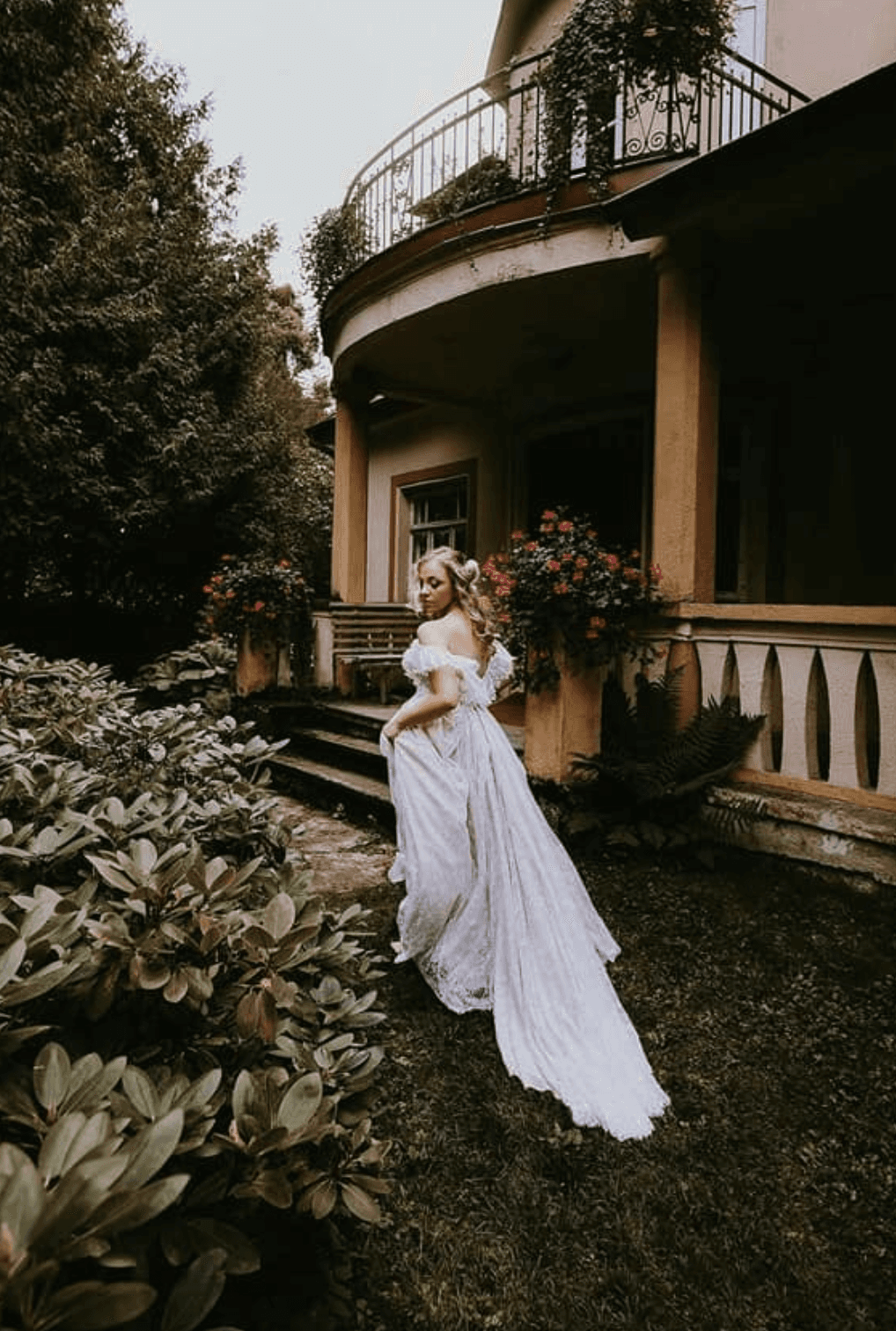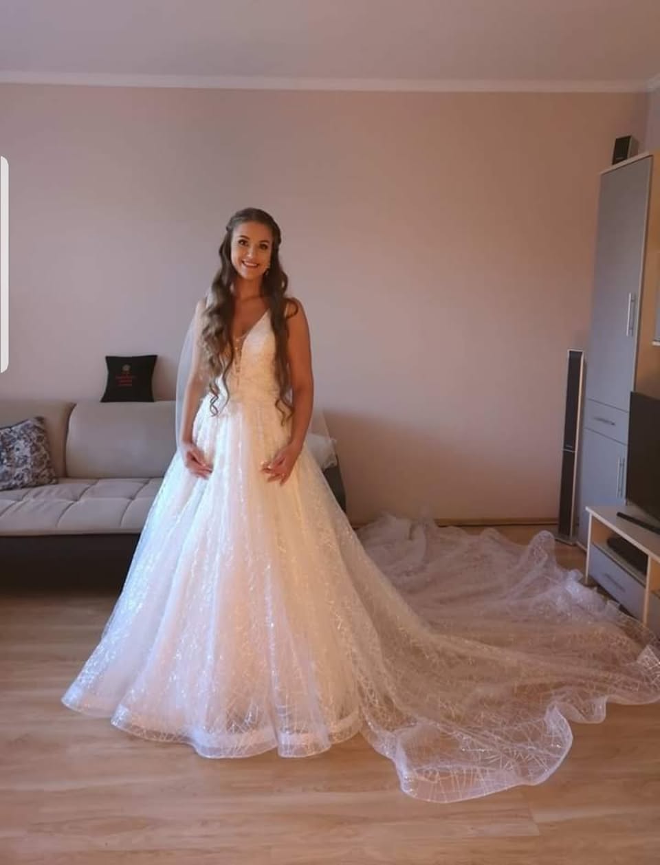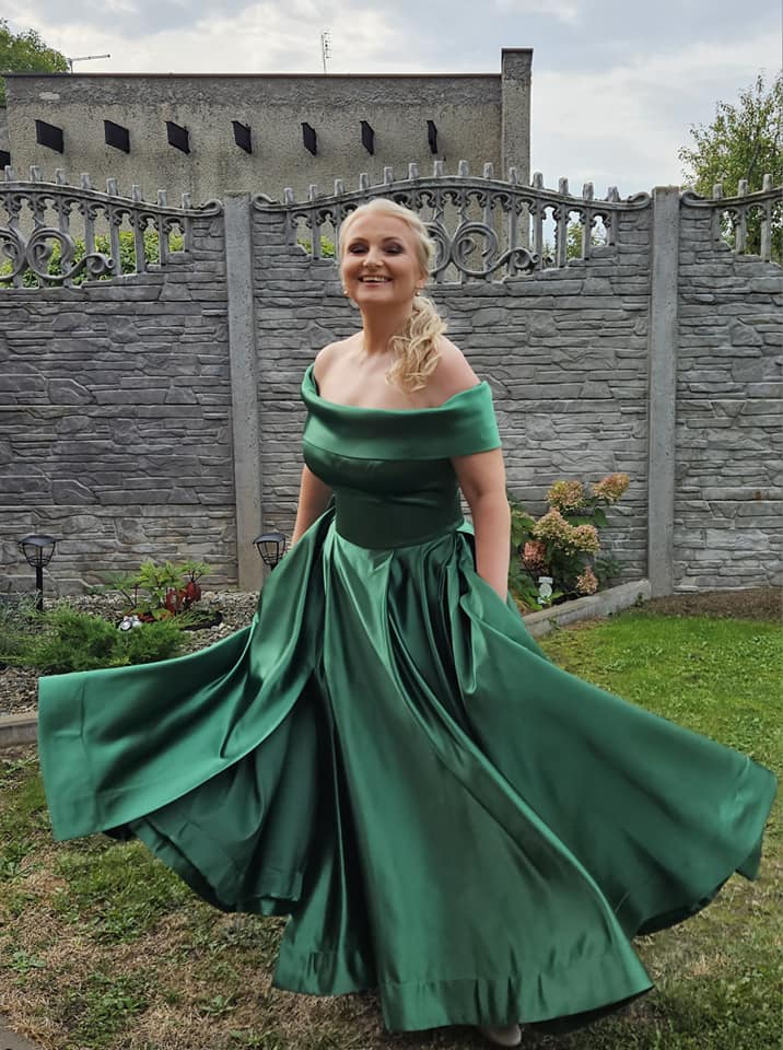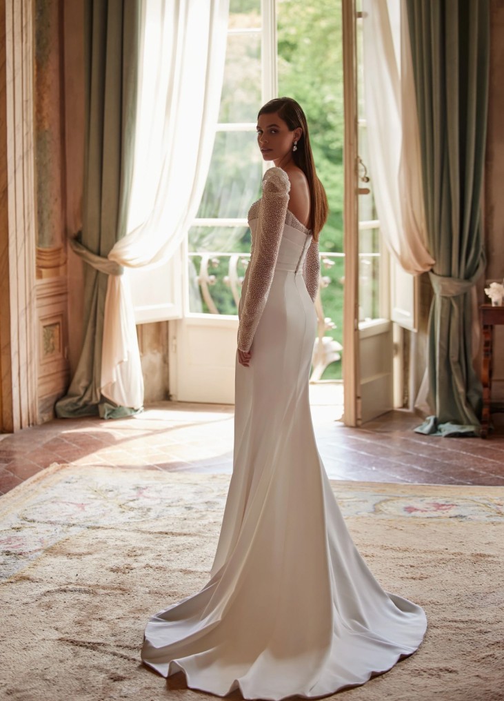 Nuotaka, vilkinti dramblio kaulo spalvos undinėlės silueto suknelę iš kostiuminio audinio, sukurs elegantiškai rafinuotą ir gundantį įvaizdį. Suknelės korsetas suformuotas su laivelio formos iškirpte priekyje ir dekoruotas įstrižomis klostėmis žemiau krūtinės linijos. Viršutinė korseto dalis puošta subtiliais siuvinėtais nėriniais. Į korseto rankovės iškirptę įsiūta ilga nėrinių rankovė. Šiek tiek įgaubta nugara žemiau menčių linijos taip pat dekoruota pagrindinio audinio klostėmis ir nėriniais, o korsetas užsegamas kabliukais su praplatinimu. Sijonas ties klubais prigludęs, apačioje pereinantis į elegantišką šleifą. Priekyje, dešinėje pusėje, yra gundantis skeltukas, suteikiantis patogumo judant ir subtiliai atidengiantis liekną koją. Priekinė sijono dalis dekoruota įstrižomis klostėmis, prasidedančiomis nuo šoninės siūlės. Sijonas nugaroje, centre, užsegamas paslėptu užtrauktuku.