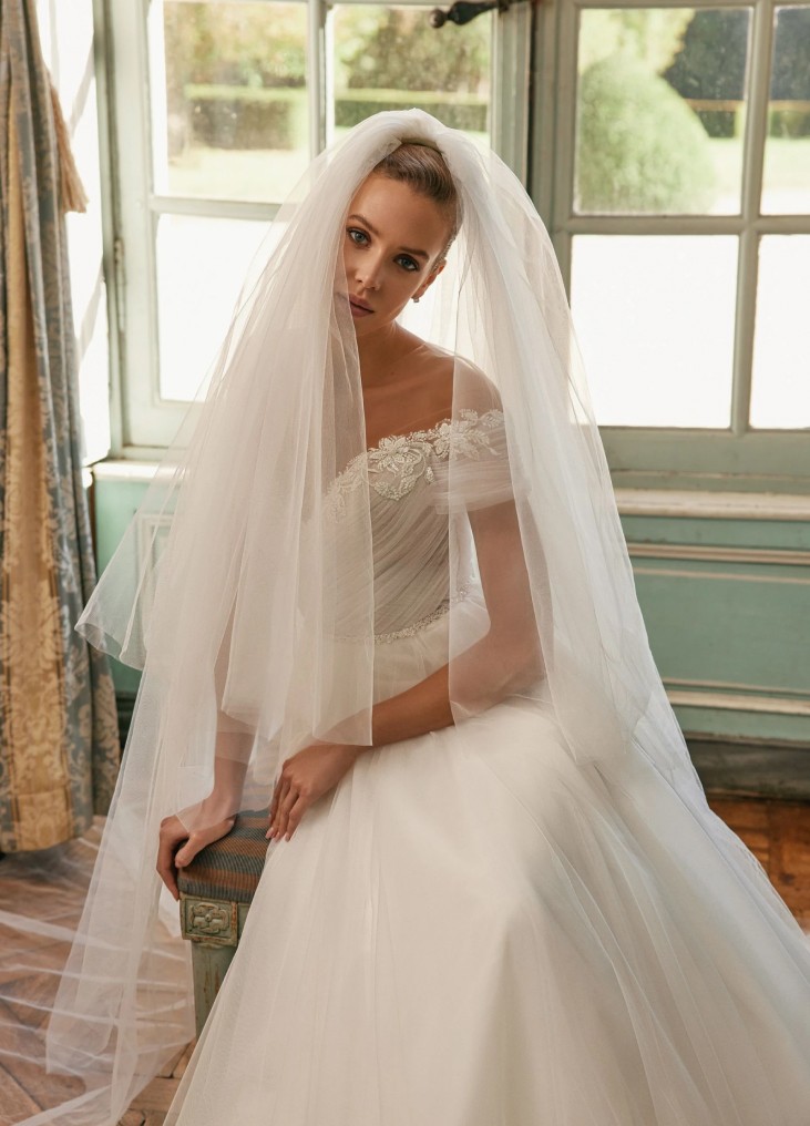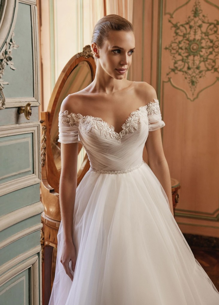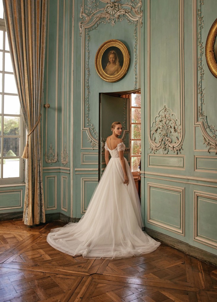 Ši Pollardi "Narissa" suknelė įkūnija didingą prabangą ir aristokratišką eleganciją. Pečius atidengianti nėriniuota viršutinė dalis su subtiliais siuvinėjimais sukuria romantišką ir rafinuotą įvaizdį, pabrėždama dekoltė liniją. Figūrą formuojantis korsetas suteikia struktūros, o rankų darbo nėrinių aplikacijos prideda išskirtinio grožio ir detalumo. Lengvai krentantis, daugiapakopis tiulio sijonas su ilgu šleifu suteikia lengvumo ir karališko didingumo efektą. Tai tobula suknelė nuotakai, kuri nori jaustis kaip tikra karalienė, derinant klasiką su subtiliu romantizmu.