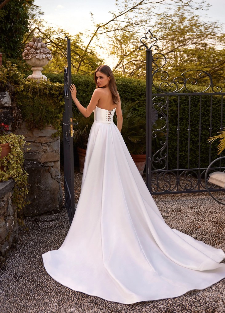 A linijos suknelė iš dramblio kaulo spalvos Mikado audinio padės nuotakai sukurti originalų, seksualų, drąsų ir stilingą įvaizdį. Korsetas suformuotas su V formos iškirpte priekyje, o centre turi kūno spalvos tinklelio intarpą. Korsetas dekoruotas įstrižai išdėstytu kaspinu iš Mikado audinio. Korseto nugara yra ovalo formos ir užsegama kilpelėmis bei raišteliais iš to paties audinio. Aplink suknelės liemenį įsiūtas dirželis, taip pat pagamintas iš pagrindinio audinio. Sijonas pūstas dėl klosčių, turi prabangią šleifą ir patogias paslėptas kišenes. Sijono užsegimas – paslėptas užtrauktukas. Taip pat galima pagaminti šią suknelę su korseto užsegimu nugaroje kabliukais su praplatinimu.