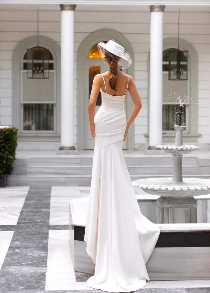 Ši Pollardi "Sahana" suknelė – tai modernios elegancijos ir prabangos įsikūnijimas. Plonos petnešėlės ir švelniai drapiruotas korsetas suteikia lengvumo ir moteriškumo, o asimetriškai klostuotas audinys ties juosmeniu išryškina figūrą, suteikdamas išskirtinį siluetą. Aukštas skeltukas prideda jausmingumo ir dinamiškumo, leidžiant nuotakai atrodyti drąsiai, bet kartu išlaikant rafinuotą stilių. Lengvas, elegantiškai krentantis audinys sukuria nepriekaištingą kritimą ir judesio grakštumą. Derinys su prabangiu nuometu ar moderniu aksesuaru, kaip matoma nuotraukoje, suteikia dar daugiau individualumo. Tai tobula suknelė nuotakai, vertinančiai minimalistinę prabangą, šiuolaikinį stilių ir subtilų jausmingumą.