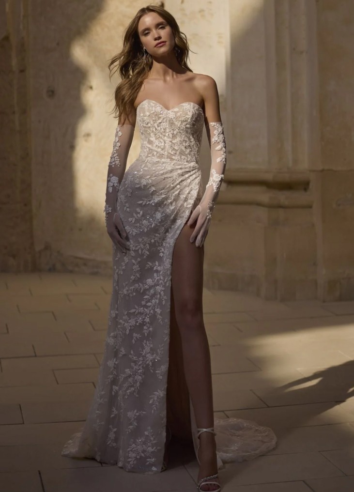Ši vestuvinė suknelė spinduliuoja prabanga, rafinuotu seksualumu ir išskirtiniu moteriškumu. Prigludęs undinėlės siluetas elegantiškai išryškina kūno linijas, o korsetinė viršutinė dalis su širdelės formos iškirpte subtiliai pabrėžia dekoltė zoną. Visas suknelės paviršius dekoruotas kruopščiai siuvinėtais nėrinių raštais, kurie suteikia tekstūros ir prabangaus spindesio. Aukštas skeltukas suteikia drąsos ir lengvumo judesiui, o ilga, elegantiškai krentanti šleifas kuria iškilmingą įvaizdį. Permatomos, nėriniais dekoruotos pirštinės tampa išskirtiniu akcentu, papildančiu visą įvaizdį subtilia drama ir modernia romantika.