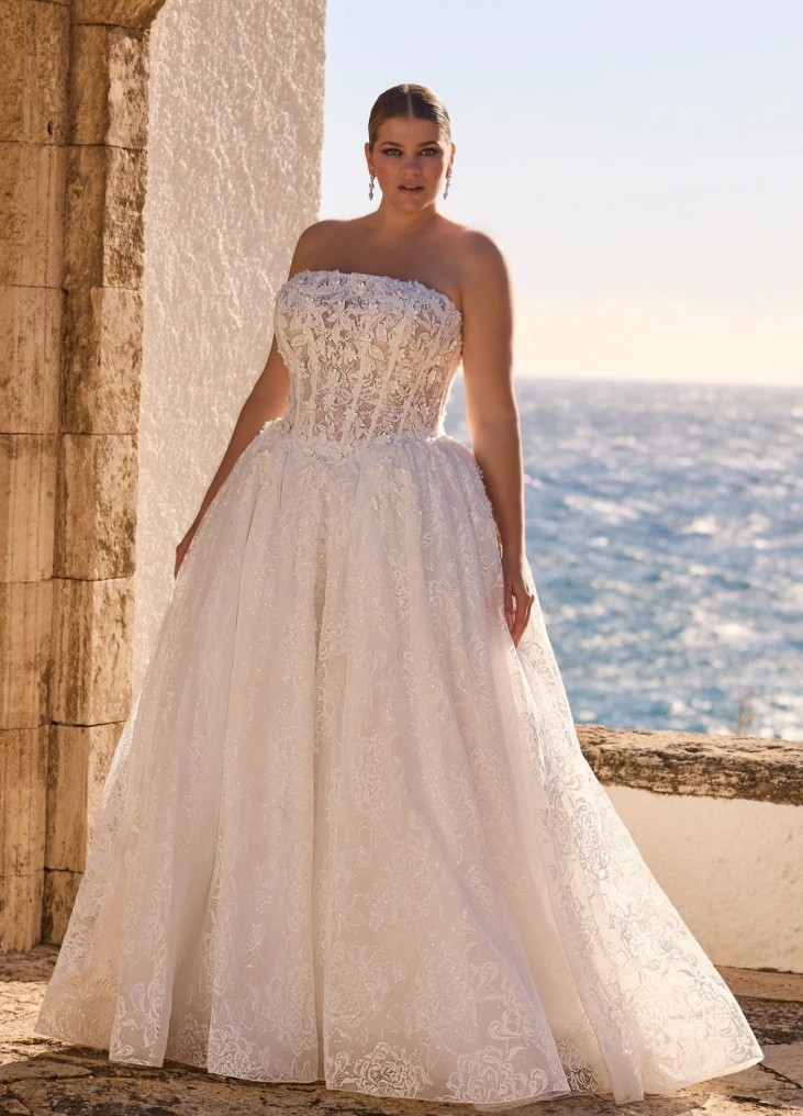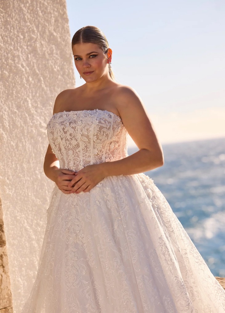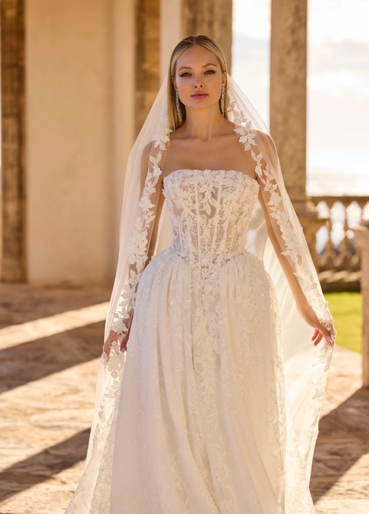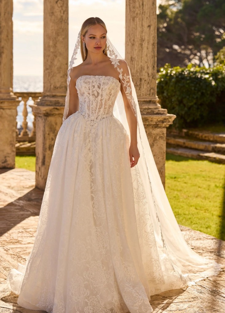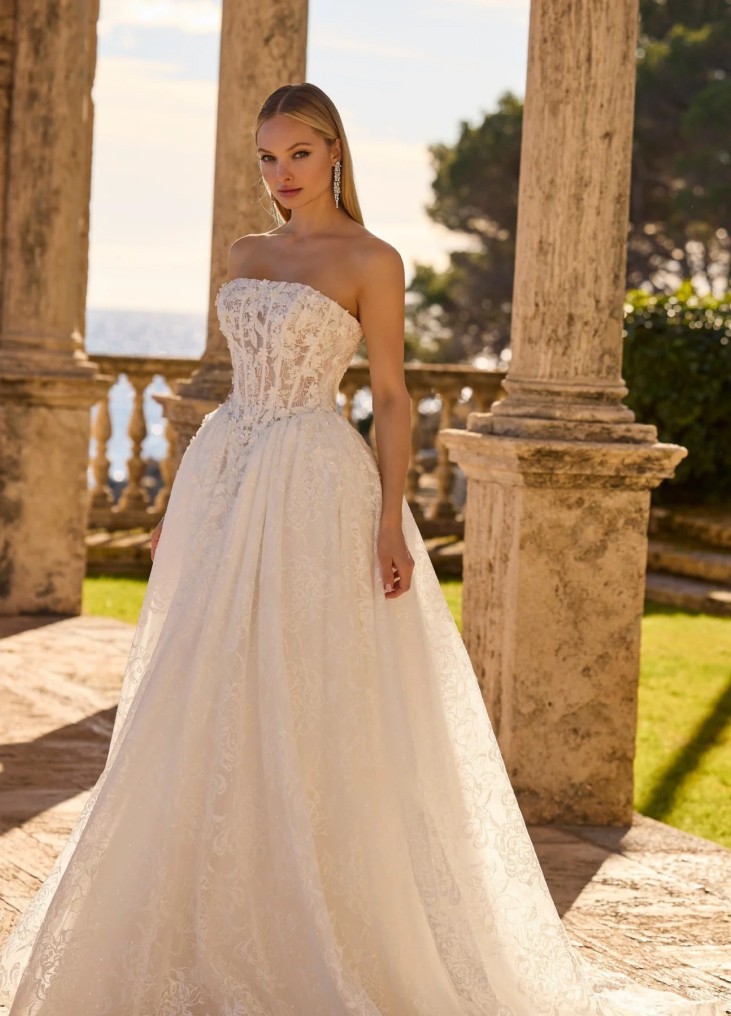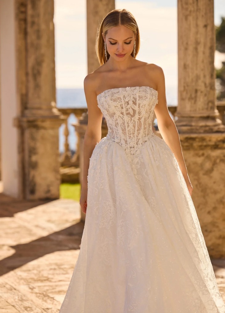Ši vestuvinė suknelė įkūnija romantišką prabangą ir klasikinę eleganciją. A linijos siluetas švelniai pabrėžia liemenį ir išsiskleidžia į lengvai krentantį, nėriniais dekoruotą sijoną su ilga šleifu. Korsetinė viršutinė dalis be petnešėlių išryškina pečius ir subtiliai formuoja figūrą, o smulkūs siuvinėti nėrinių ornamentai suteikia suknelės paviršiui tekstūros ir rafinuoto žavesio. Nugaroje esantis suvarstymas ne tik leidžia tobulai pritaikyti suknelę prie kūno, bet ir tampa elegantišku dizaino akcentu. Tai pasirinkimas nuotakai, kuri svajoja apie pasakišką, švelnų ir itin moterišką įvaizdį.