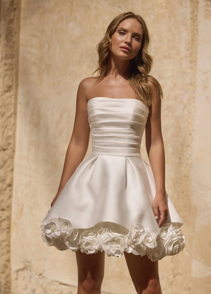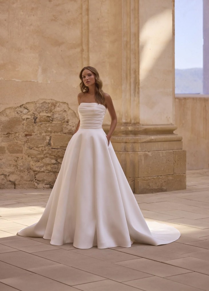 Ši vestuvinė suknelė įkūnija švarią klasiką ir modernų minimalizmą. A linijos siluetas elegantiškai pabrėžia liemenį ir išsiskleidžia į platų, struktūrišką sijoną su subtilia šleifu. Tiesi korsetinė viršutinė dalis be petnešėlių dekoruota horizontaliomis drapiruotėmis, kurios suteikia tekstūros ir subtiliai išryškina figūrą. Suknelės audinys atrodo tvirtas ir prabangus, gražiai laikantis formą bei sukuriantis skulptūrišką siluetą. Diskretiškos kišenės suteikia šiuolaikiškumo ir patogumo, o visas įvaizdis spinduliuoja santūria elegancija ir rafinuotu stiliumi.