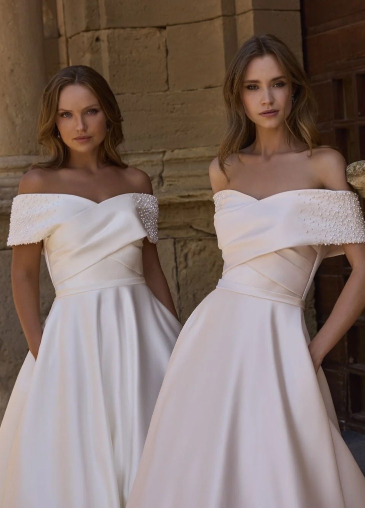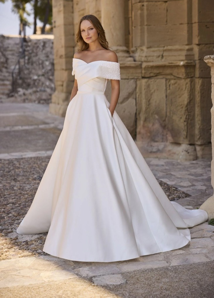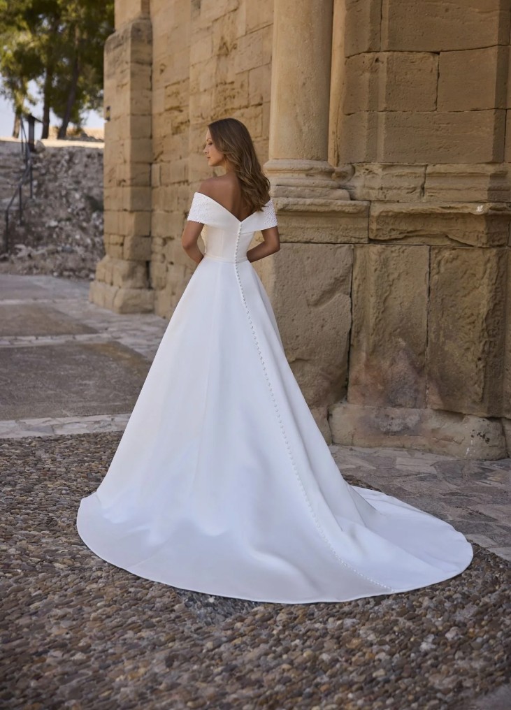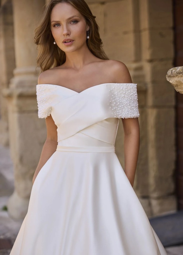 Ši vestuvinė suknelė išsiskiria elegantišku minimalizmu ir subtiliais prabangos akcentais. A linijos siluetas švelniai pabrėžia liemenį ir išsiskleidžia į lengvai krentantį sijoną su ilga, grakščia šleifu. Korsetinė viršutinė dalis su širdelės formos iškirpte ir nuleistais pečiais dekoruota kryžminėmis drapiruotėmis, kurios suteikia struktūros ir rafinuotumo. Rankovių kraštai subtiliai puošti smulkiais perlų akcentais, suteikiančiais švelnaus spindesio. Nugaroje per visą ilgį einanti sagų eilė tampa elegantišku dizaino akcentu. Tai suknelė nuotakai, kuri vertina klasiką, tačiau nori išlikti moderni ir išskirtinė.